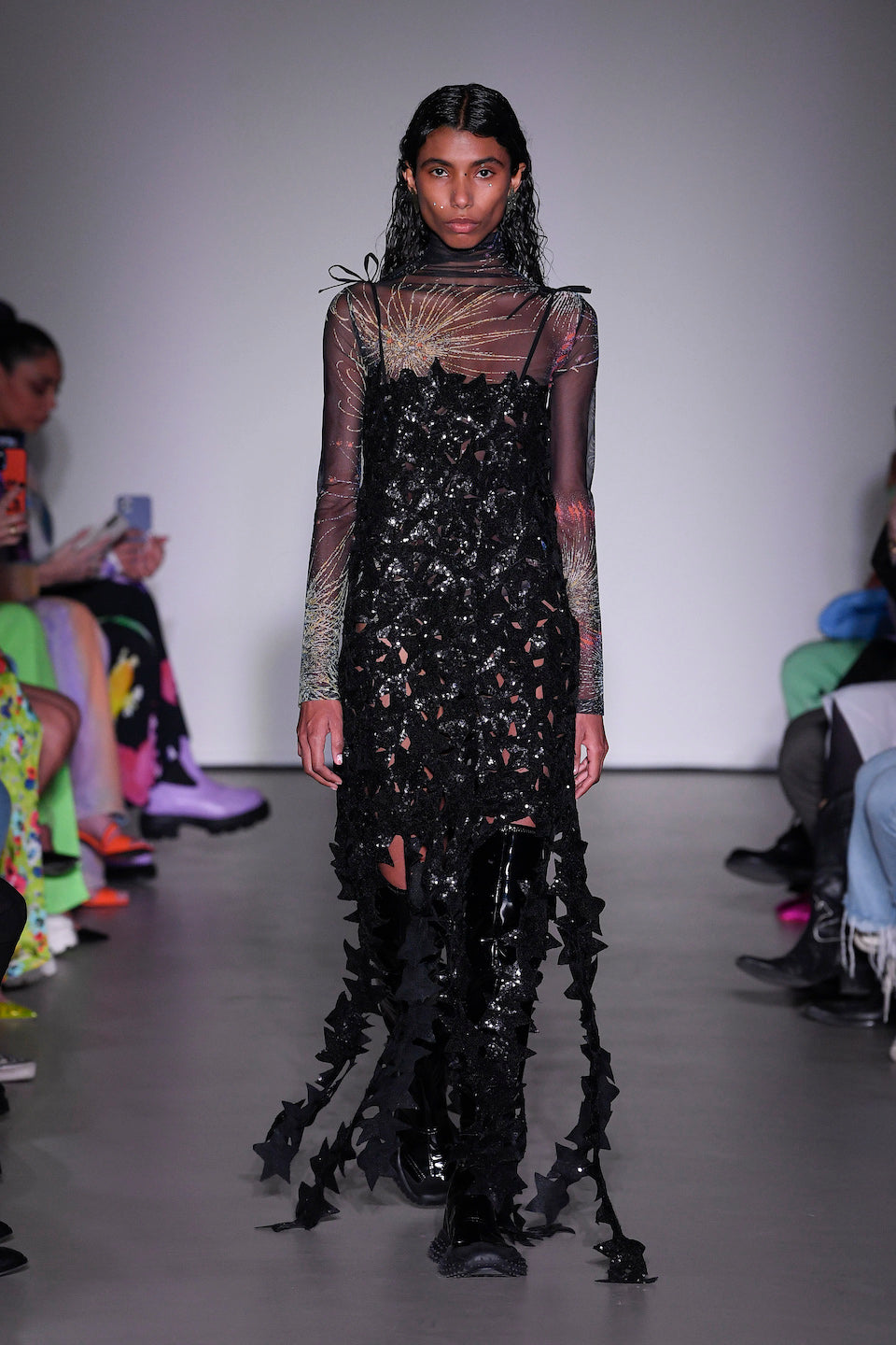 The Fall/Winter 2022 collection is also light in the dark: night-time atmospheres are expressed in a dark palette that is broken up by shimmering tones and shiny, precious materials. This is a new territory and an unexpected one for MSGM. Extreme minimalism with black and silver chasing each other on plain fabrics that are embellished with outline embroidery, beads and sequins. The attitude is sensual, post meridiem: short and feminine dresses, or long “dresses to impress”, tops that open into single-shoulder geometries or criss-crossings, knitwear second-skin suits that swathe the body and ripple in sinuous ruffles.