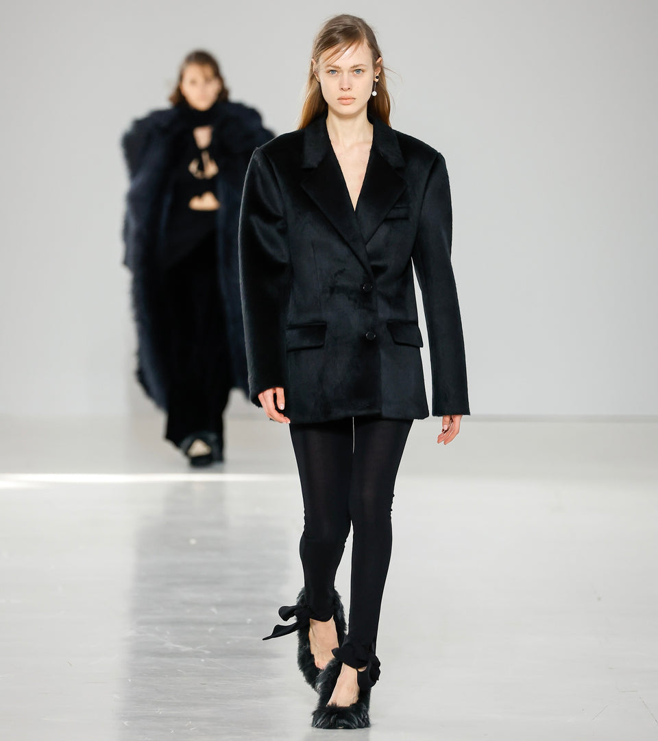 Fabric and skin. Transparent knitwear, ribbons and knots. Glimpses of light. Metallic pearls, lurex. Faux fur everywhere, all fluffy everything. Hairy accessories, soft clouds of bouclé wool.
